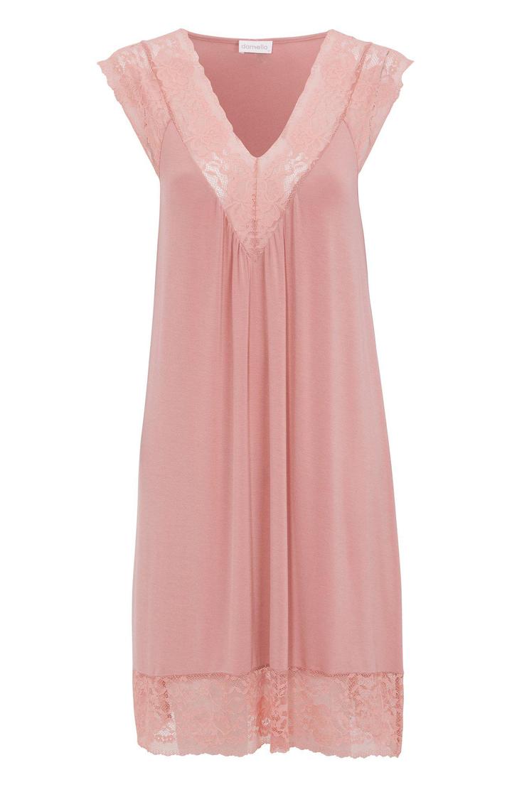 Yöpaidassa on pitsiä helmassa, sekä pääntiessä.