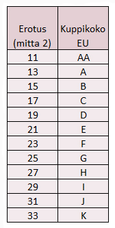 Mitan 1 ja 2 erotuksesta löydät kuppikokosi alla olevasta taulukosta.
