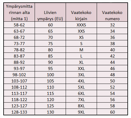 Tarkista, että mitta on samalla korkeudella sekä edestä että takaa, ja ota oikein tiukka mitta. Liivien materiaalit ovat aina joustavia, mutta mittanauha ei jousta lainkaan. Katso itsellesi sopiva ympärysmitta taulukosta, jos esimerkiksi mittasit 83-87 cm, on ympäryksesi todennäköisesti 85. - Mitta rinnan päältä