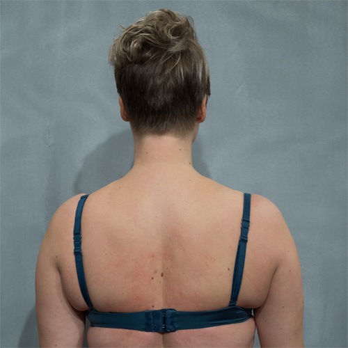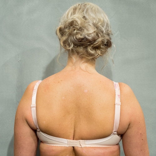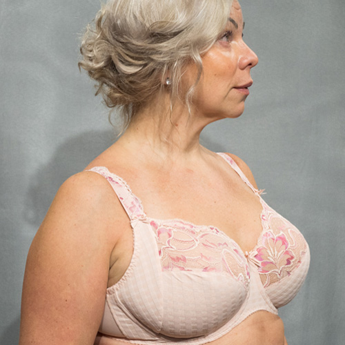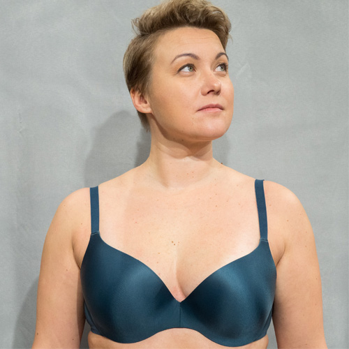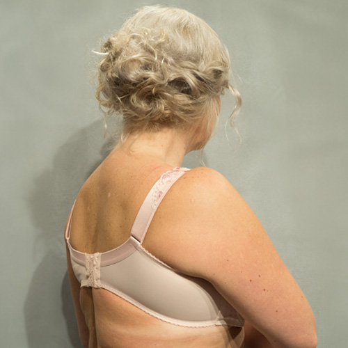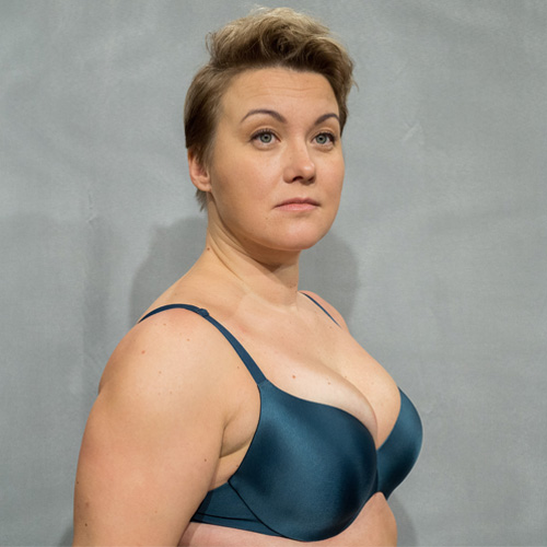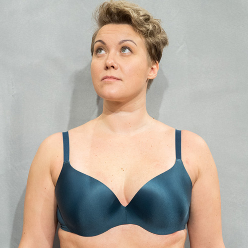 Mallilla on tässä yllään oikean kokoiset rintaliivit, mutta toisen puolen olkain on säädetty aivan liian löysäksi ja tämän vuoksi kuppi pääsee valumaan liian alas.