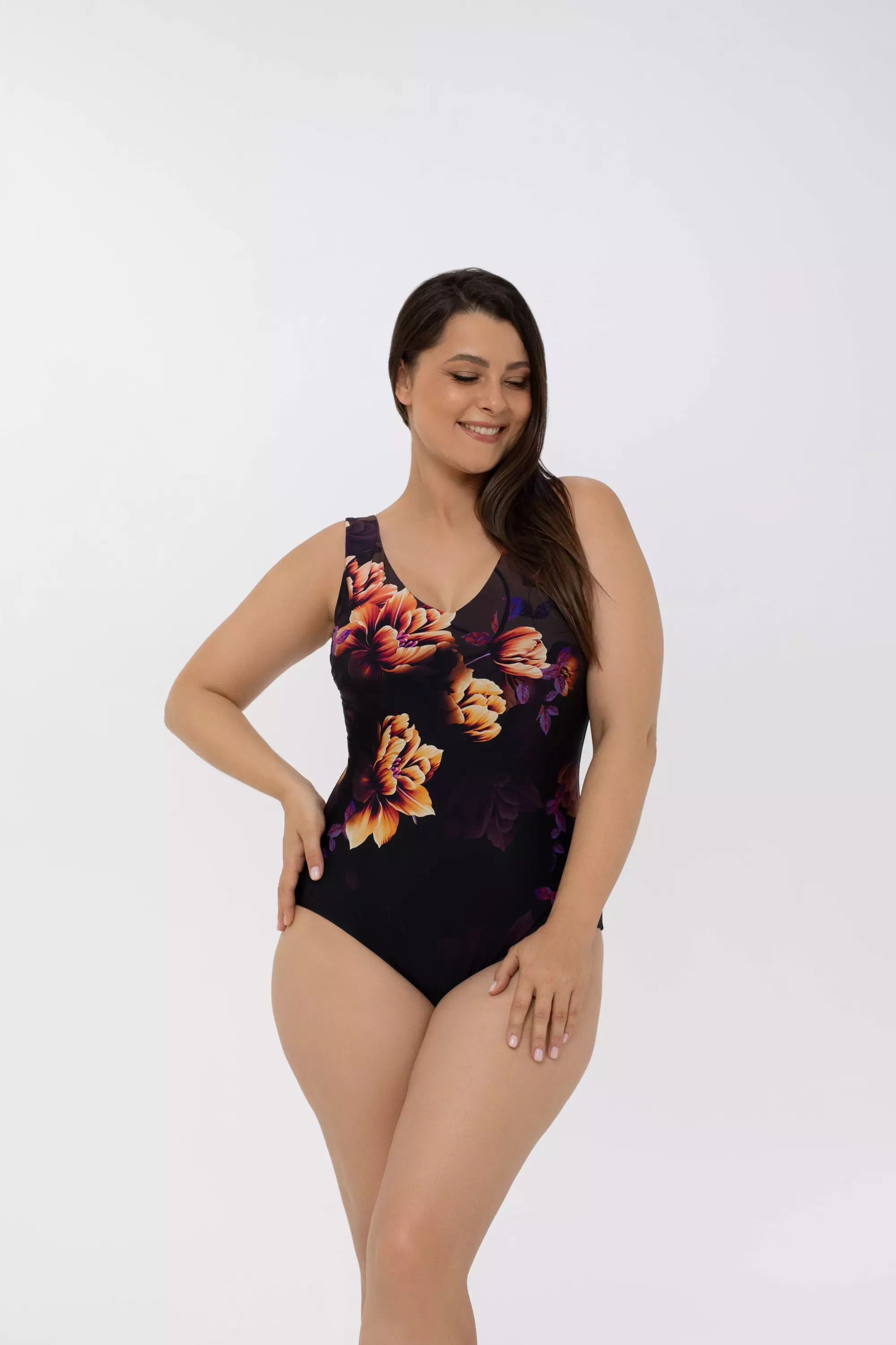 Uimapuvun pohjaväri on musta ja se on koristeltu upealla, epäsymmetrisellä kukkakuosilla.