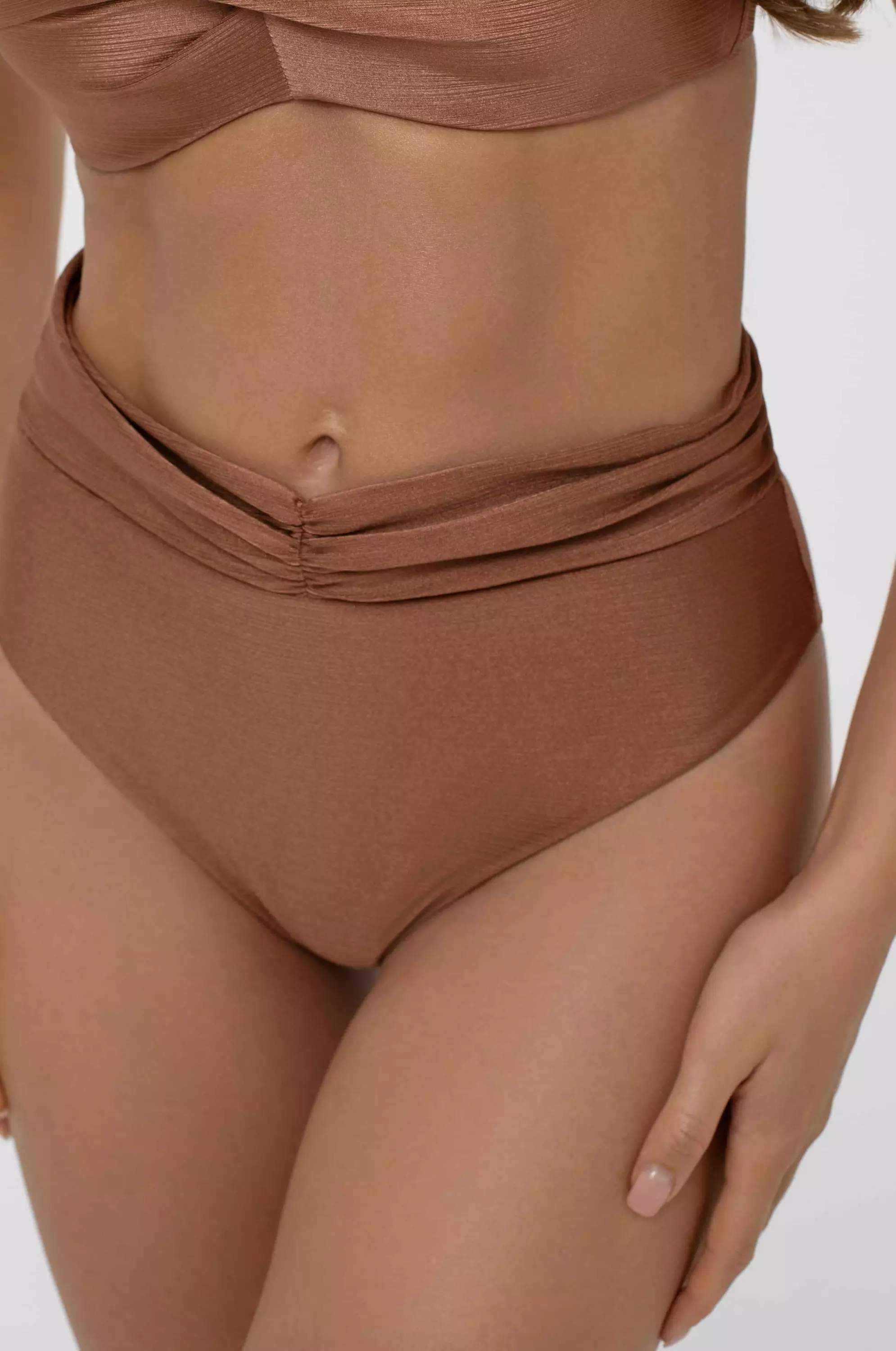 Bikinihousujen ruskea kangas on todella kaunista, hohtavaa ja teksturoitua.