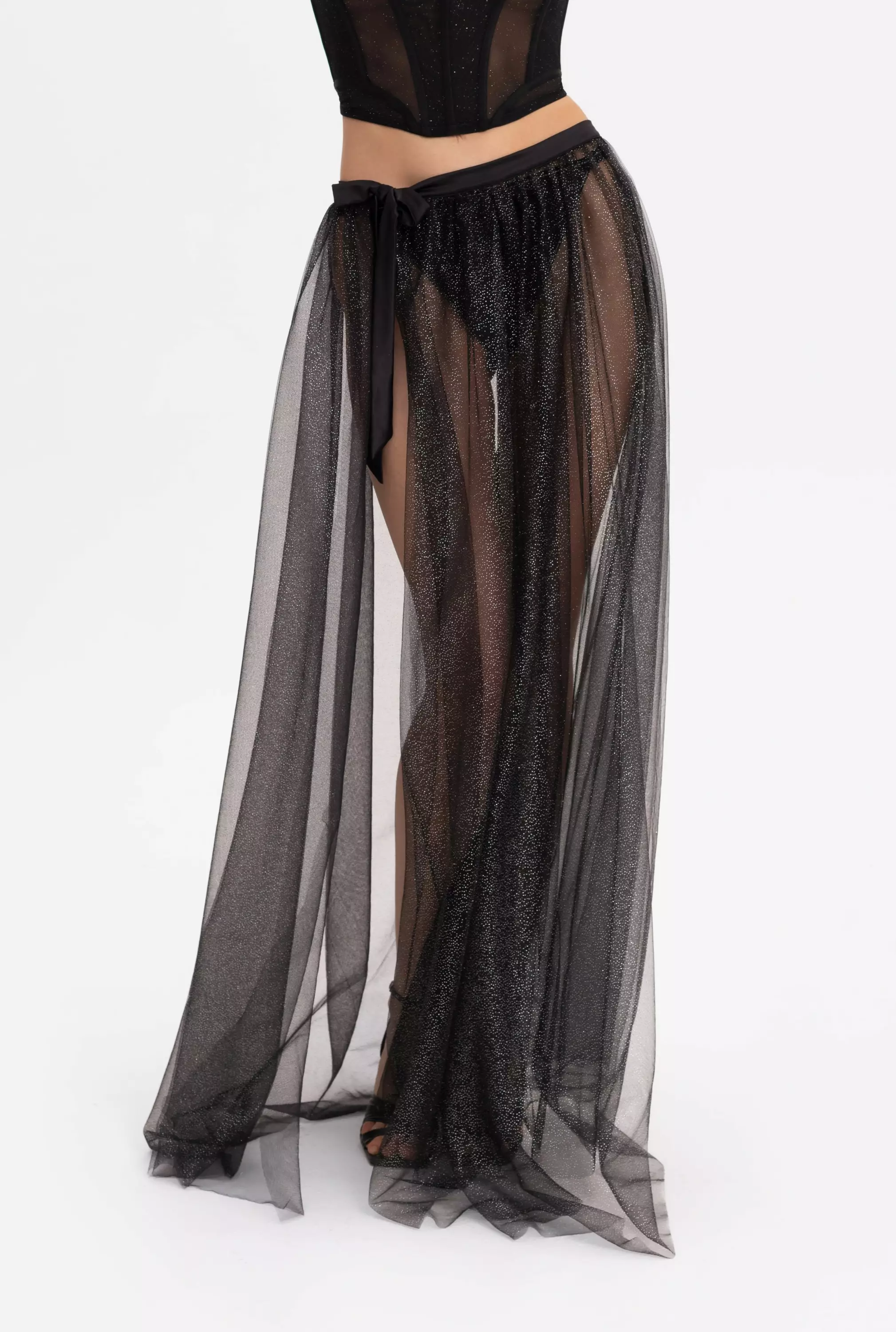 Hame on kokonaan tyllimäistä ja läpinäkyvää, mustaa kangasta, jossa on hopeista kimalletta koristeena.