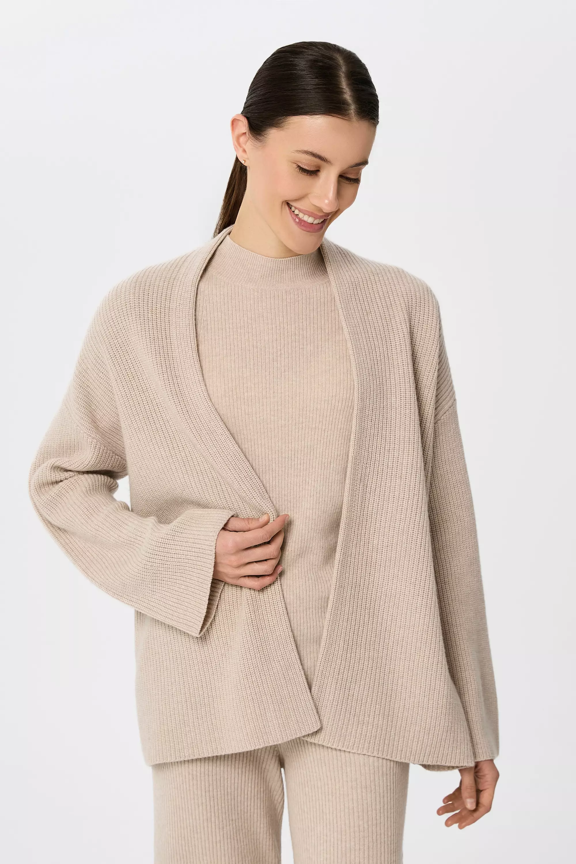 Takki on ribattua neulosta ja laskeutuu päällä todella kauniisti.