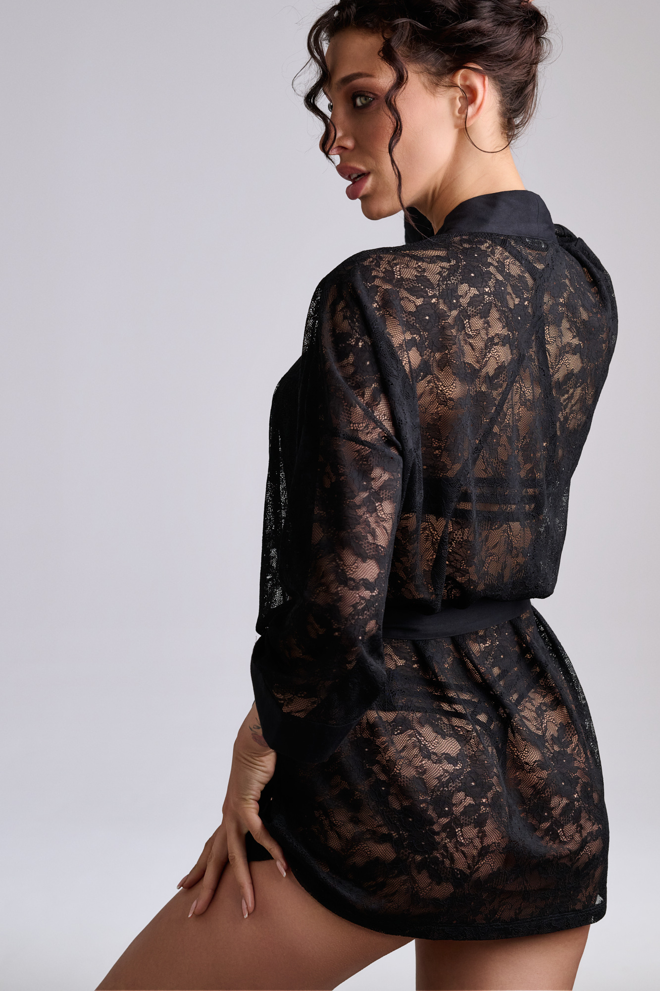 Kimono on kokonaan erittäin laadukasta pitsikangasta, joka tuntuu iholla pehmeältä.