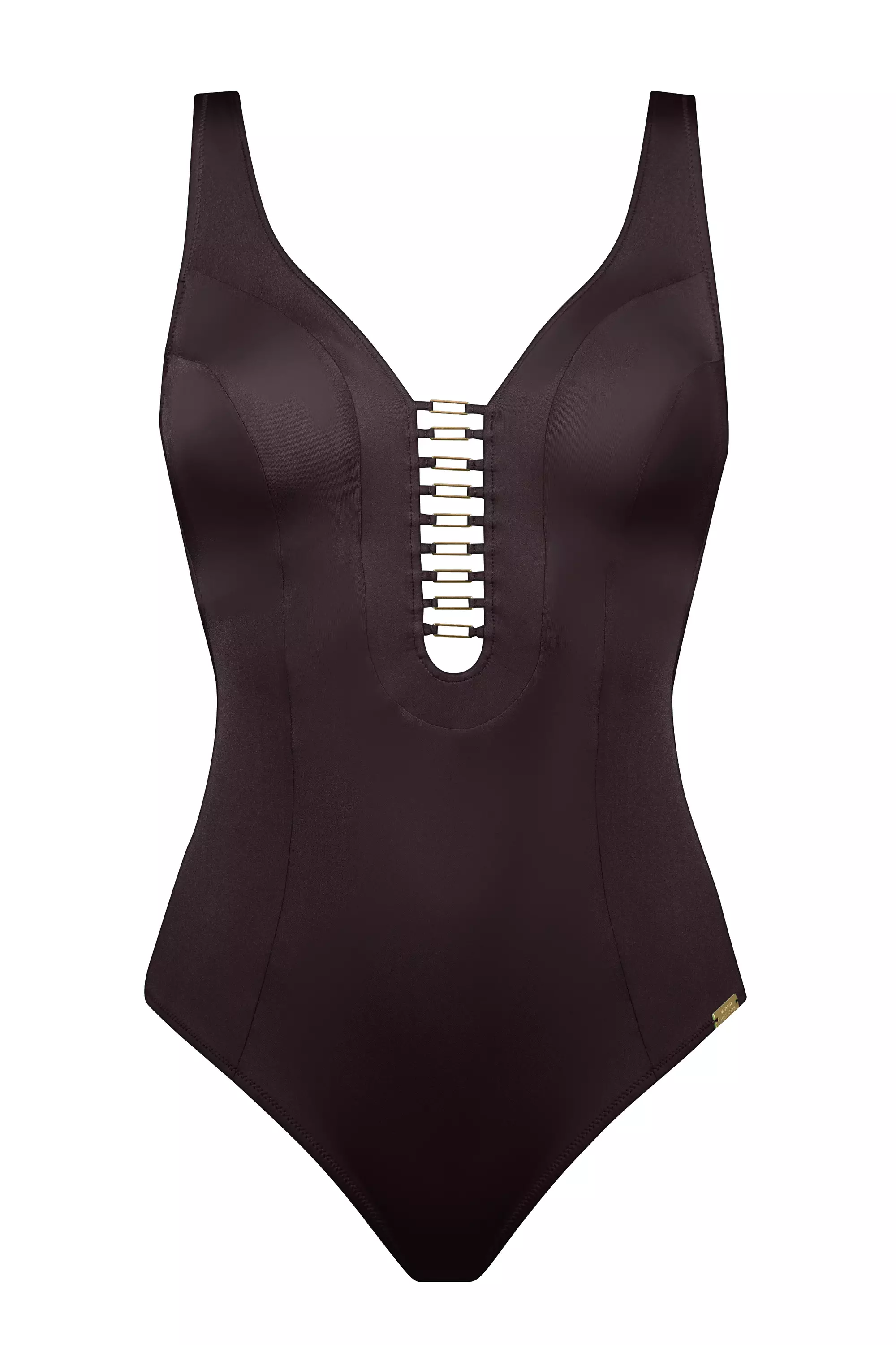 Uimapuku on kokonaan erittäin tyylikkään ruskeaa, yksiväristä kangasta.