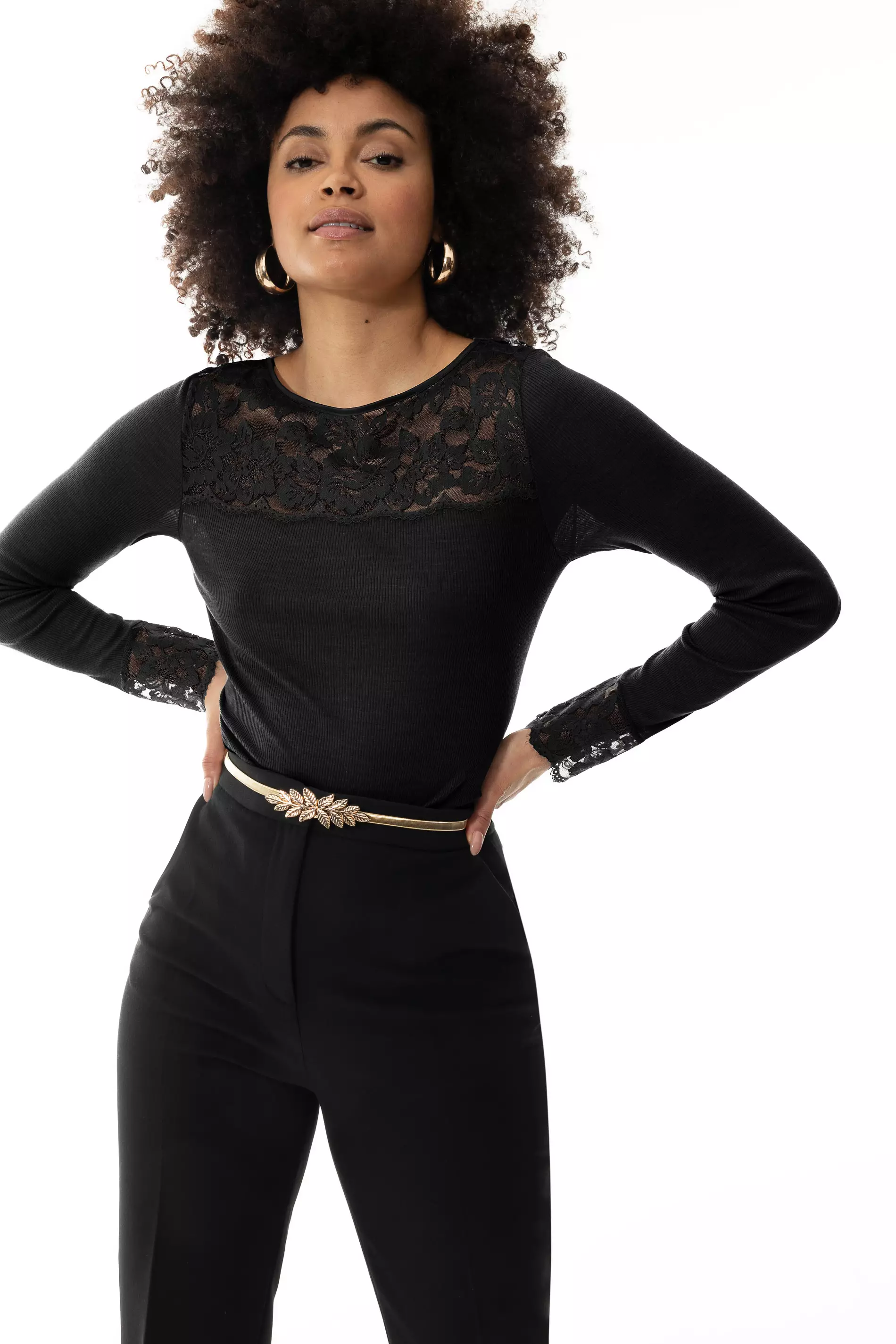 Myös pitkiä hihoja somistaa leveä pitsi.