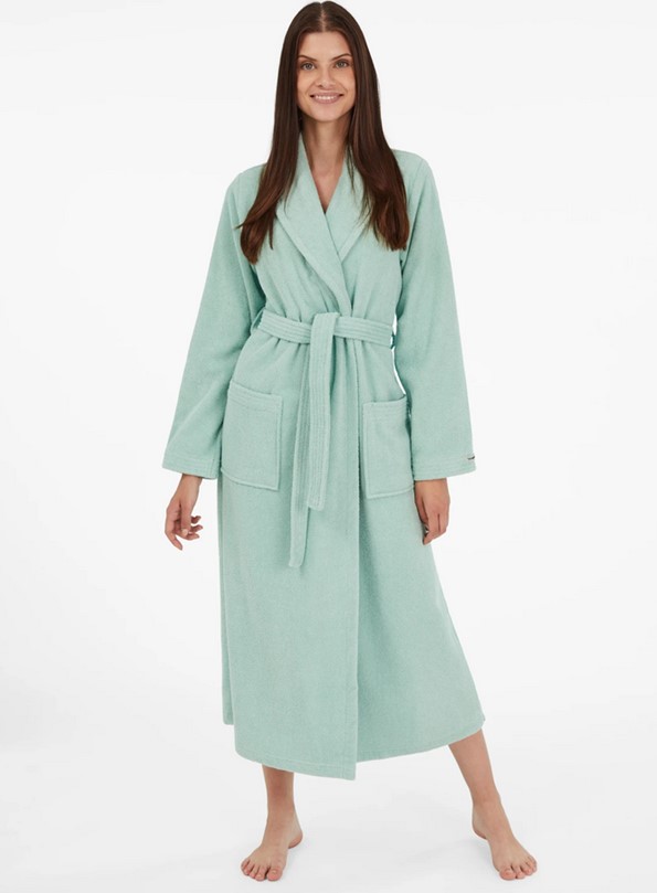 Takki on 130cm pitkä ja siinä on taskut molemmin puolin sekä solmittava vyö.