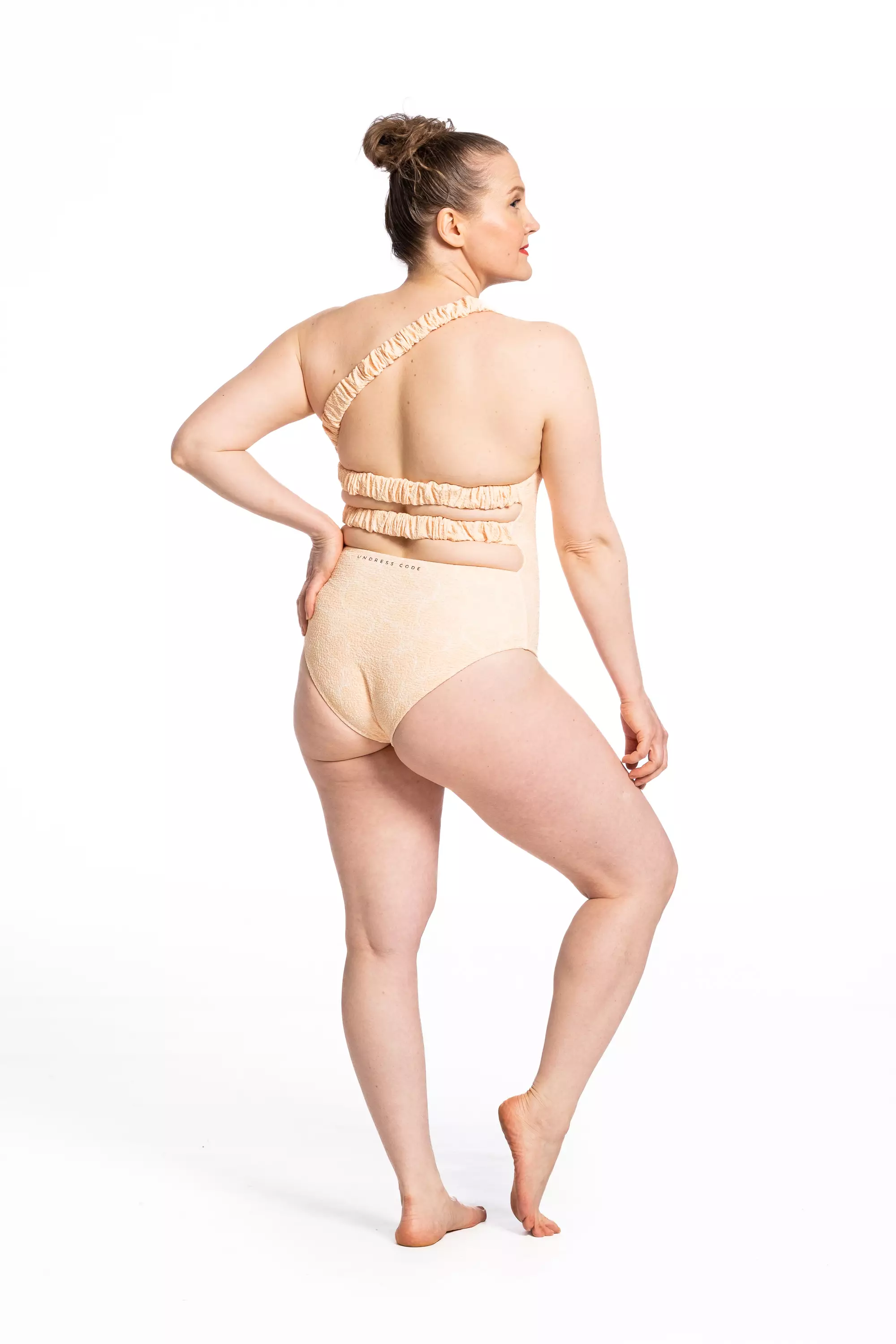 Uimapuku on yksiolkaiminen ja selässä on kolme rypytettyä, leveää nyöriä.