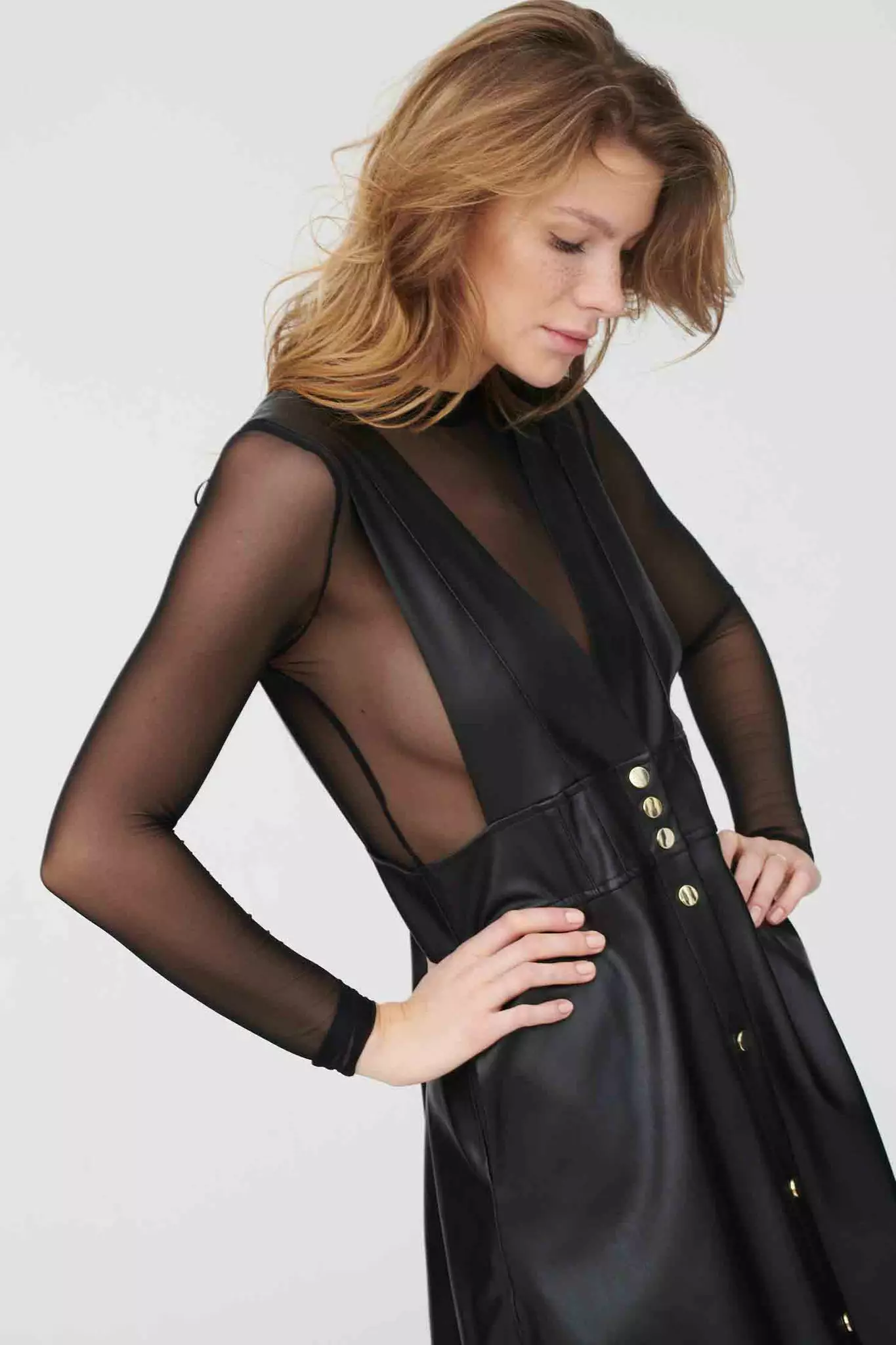 Bodyssa on pitkät, tyköistuvat hihat sekä kilpikonnakaulus ja painonapit haaraosassa.