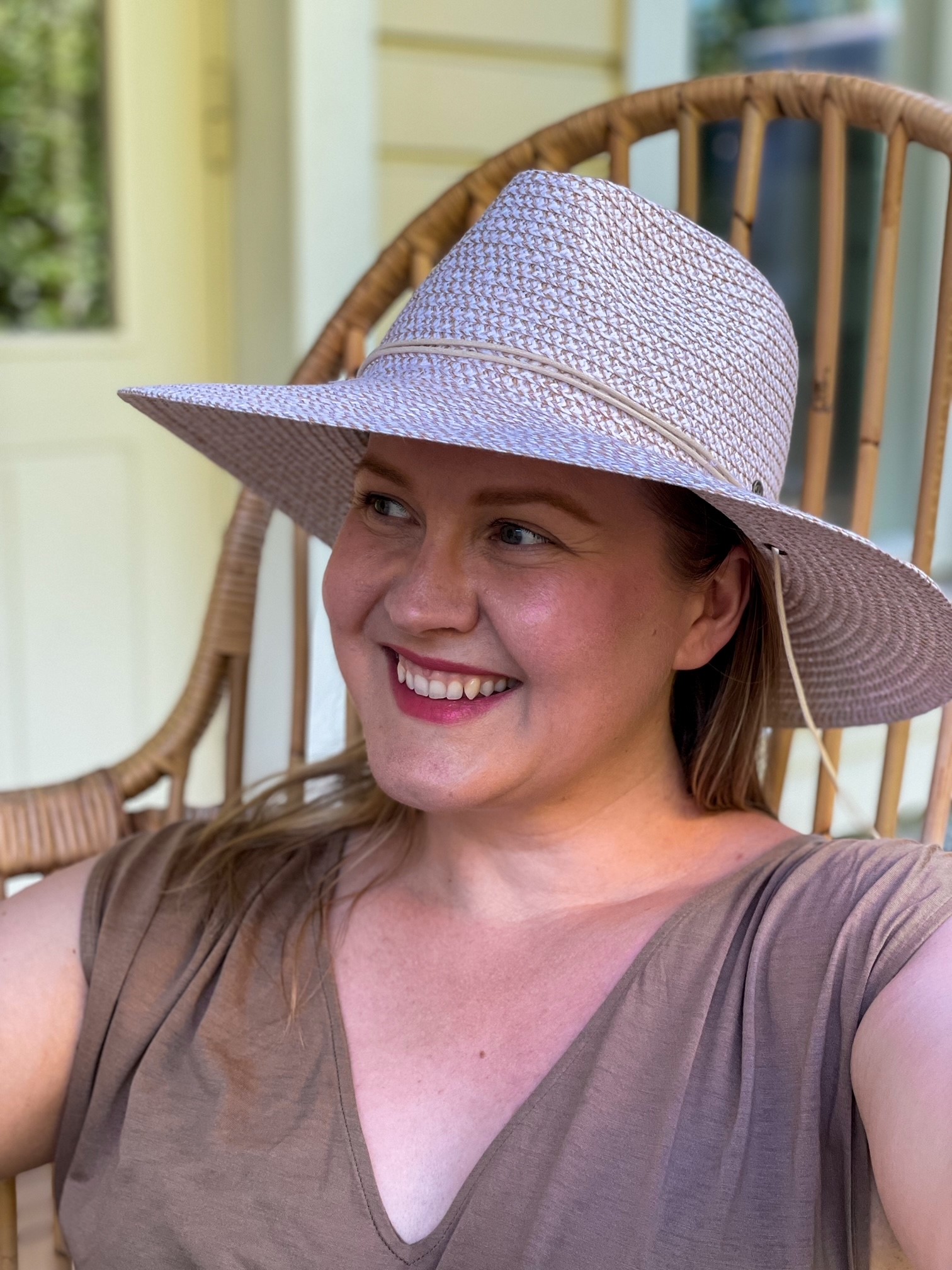 Hattu on kaksivärinen - pohjaväri on luonnonvaalea ja tehostevärinä on vaalean beige.